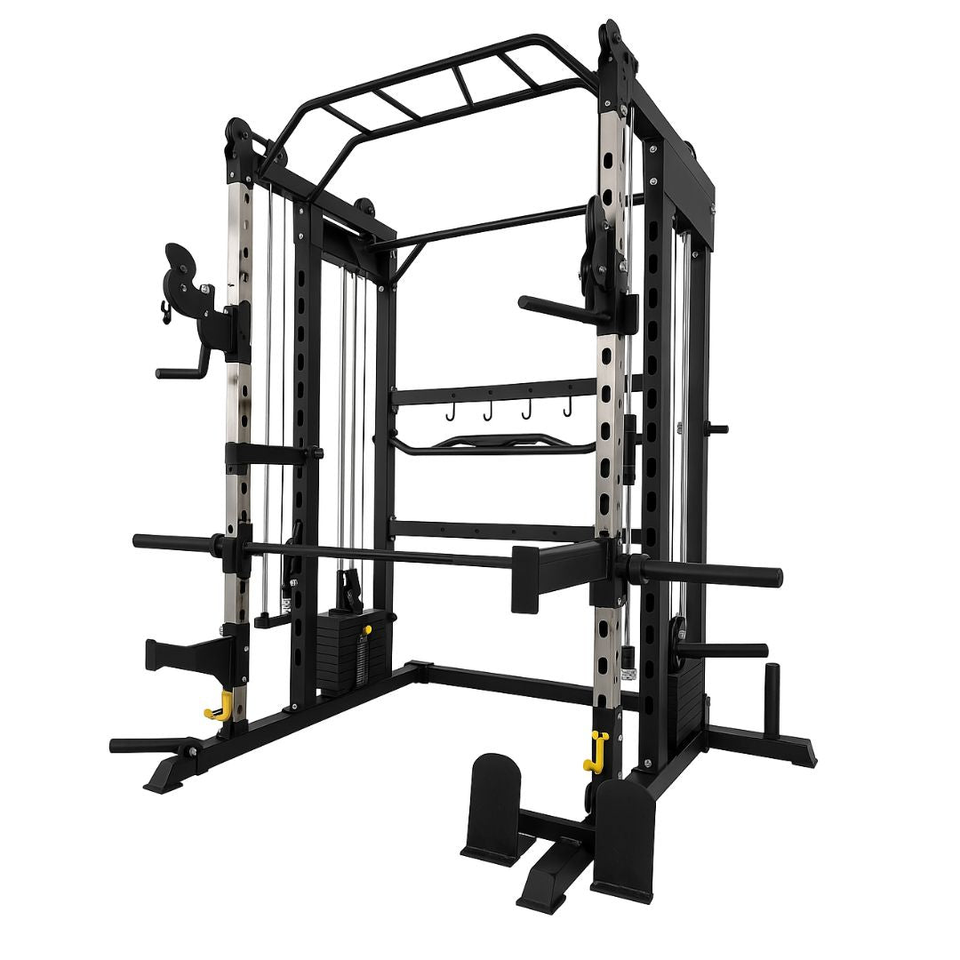 Dimensiones (L X A x H): 200 x 165 x 216 cm Peso: 420 kg Stack de peso: 55 kg 1. Smith machine 2. Rack de sendilla libre *J-Cups x2 *Brazos de seguridad 3. Brazos para fondos 4. Doble polea ajustable/ Functional trainer 5. Barra para pull-up 6. Soporte para jalón de espalda 7. Soporte para remo 8. Landmine 9. Soporte para peso adicional Manerales Agarres D de Nylon x2 Barra recta corta Barra larga pulldown Cuerda para tríceps Agarre V para remo con barra Grilletes